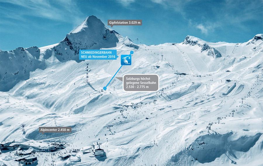 In juli 2016 zijn op de Kitzsteinhorn, gletsjer van Kaprun, de bouwwerkzaamheden begonnen van de Schmiedingerbahn. Een 8-persoons stoeltjeslift met stoelverwarming en kap. Deze nieuwe lift vervangt de oude Schmiedinger sleeplift. Deze lift is direct de hoogste stoeltjeslift in het Salzburgerland. De lift start op 2530 m en het bergstation ligt op 2775 meter. De ingebruikname van de hoogste stoeltjeslift van Salzburg is gepland in november 2016