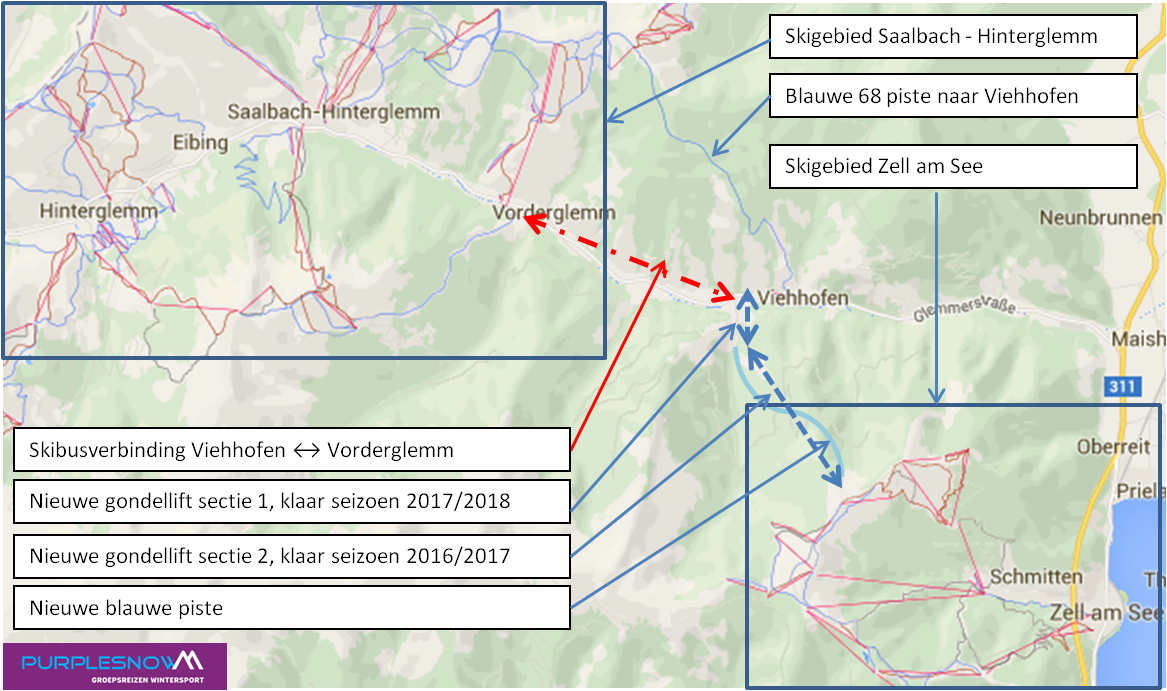 Wanneer je van Saalbach naar Zell am See wilt kun je via de blauwe 68 piste van Saalbach Hinterglemm naar Viehhofen, vanwaar je via sectie 1 en sectie 2 van de nieuwe lift naar het skigebied van Zell am See gaat.